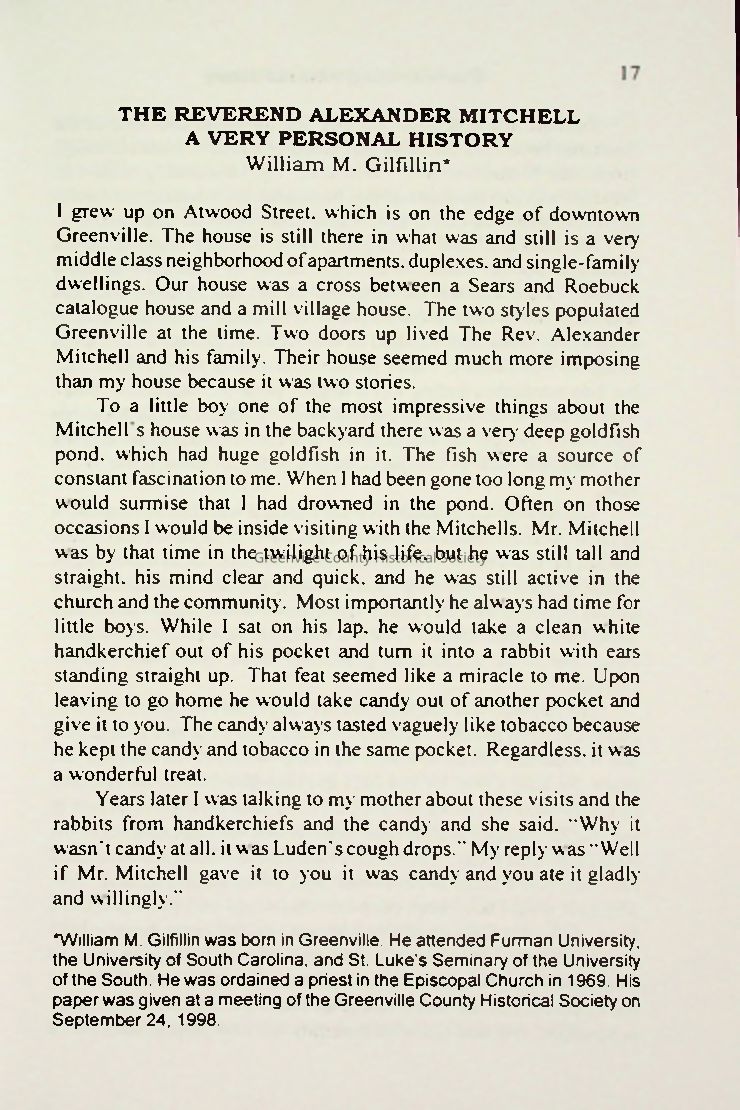 Reverend Alexander Mitchell was a deeply influential Episcopal priest known for his pastoral care, evangelistic zeal, and commitment to community building in Greenville, South Carolina. Born in 1860 in Charleston, he rose from hardship following the Civil War to establish and grow several churches, including Christ Church and multiple missions like St. Andrews and St. Phillips, the latter serving the Black community. He married twice and raised twelve children. Remembered for his long sermons, personal warmth, and humility, Mitchell’s legacy lives on through the churches he founded and the personal impact he had on generations of Greenville residents.Collection