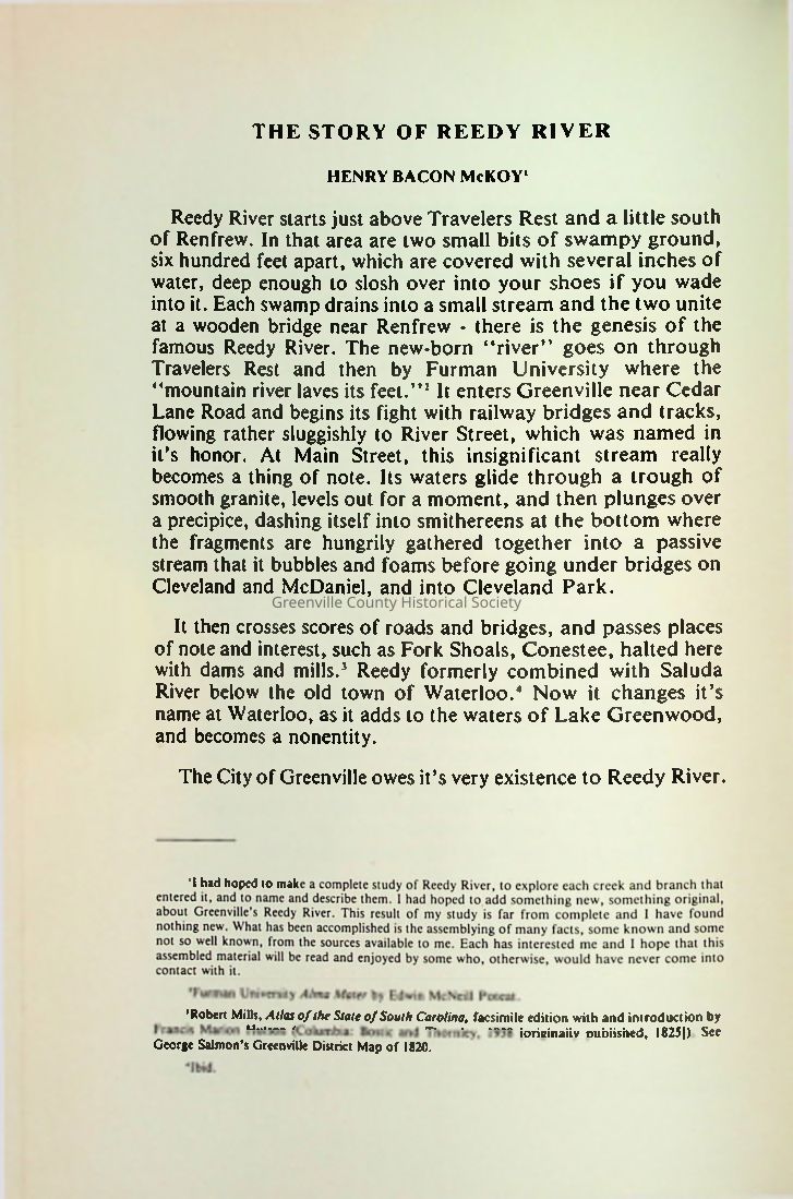 Henry Bacon McKoy’s The Story of Reedy River traces the humble origins, historical importance, and cultural significance of the Reedy River, which rises near Travelers Rest and flows through Greenville. The river fueled mills, industry, and settlement—most notably by Richard Pearis and Vardry McBee—and inspired romance, poetry, and community traditions. Landmarks like Reedy River Falls, Springwood Cemetery, and old baptismal pools mark its course. Once vital to Greenville’s development, the river shaped its economic, spiritual, and recreational life. McKoy ends by urging readers to honor its legacy, reminding us that “not all gold glitters”—some of it flows.Collection