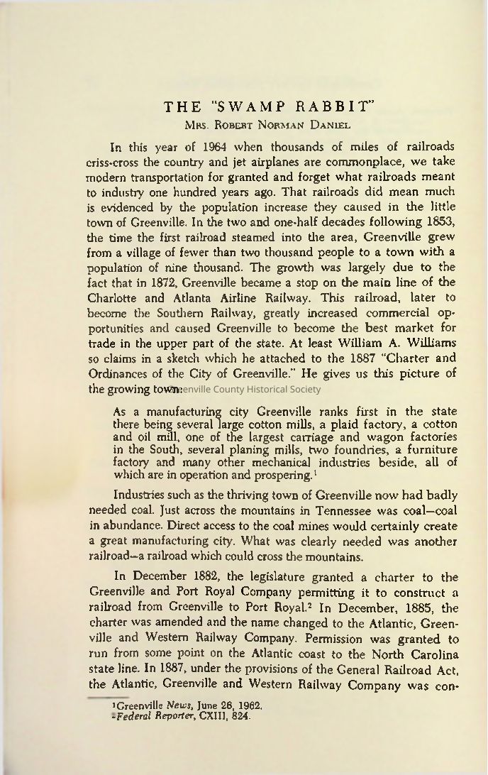 In the mid-19th century, Greenville’s development was fueled by the arrival of railroads, especially the Charlotte and Atlanta Airline Railway. Industrial growth spurred demand for coal, prompting efforts to build a mountain-crossing railroad, which became known as the “Swamp Rabbit.” Despite ambitious plans, underfunding and setbacks limited its reach to Marietta. The line changed ownership frequently and was cherished for its quirky charm and service to local communities. Ultimately, it became the Greenville and Northern Railway. Though its mountain dream failed, the Swamp Rabbit left a lasting legacy in Greenville’s history and identity.Collection