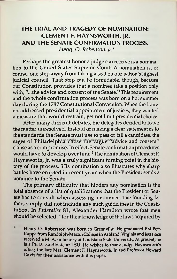 The Trial and Tragedy of Nomination: Clement F. Haynsworth, Jr. and the Senate Confirmation ProcessEntry/Object ID