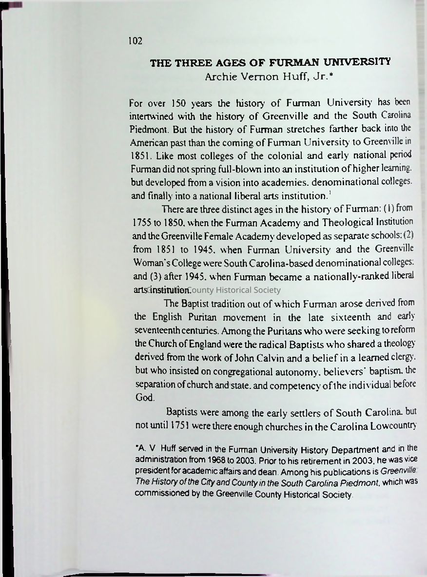 “The Three Ages of Furman University” by Archie Vernon Huff, Jr., traces Furman’s evolution from a denominational academy to a nationally recognized liberal arts university. Beginning in 1755, Furman’s roots were grounded in Baptist educational ideals. It became a Greenville-based university in 1851 and weathered financial struggles, war, and cultural shifts. Key moments include post-WWII expansion, the building of a new campus in the 1950s, and the university’s break from the South Carolina Baptist Convention in 1992 to preserve academic freedom. Huff details how Furman’s leadership and alumni helped forge its identity as an independent and prestigious institution.Collection