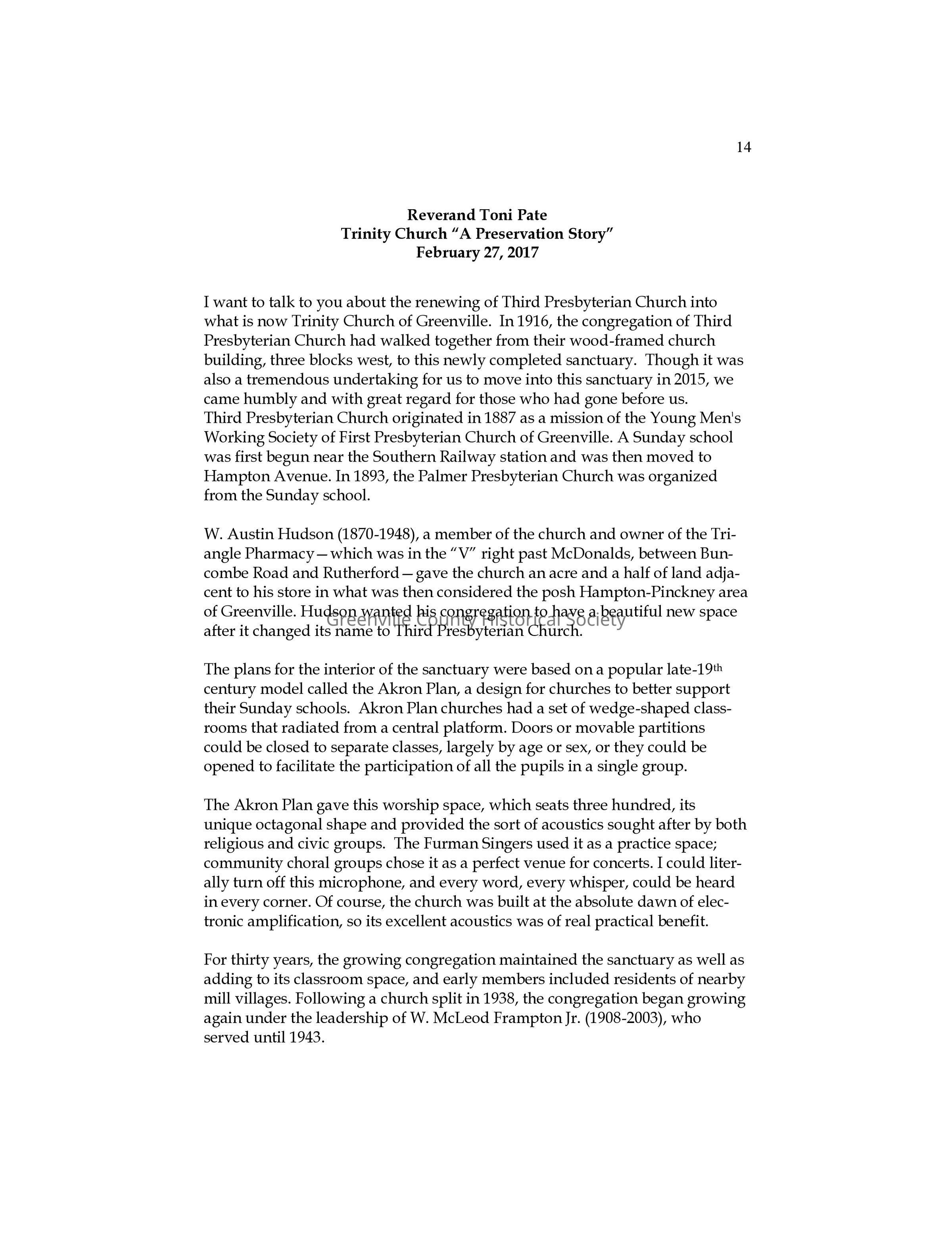 Trinity Church: A Preservation Story by Rev. Toni Pate chronicles the transformation of the historic Third Presbyterian Church in Greenville, SC, into Trinity Church. Founded in 1887, the church faced a devastating explosion in 1946 and decades of decline. By 2014, it was nearly uninhabitable. A small new congregation, Trinity Church, undertook the building’s restoration despite major structural and financial challenges. With community support and preservation expertise, the church was saved and rededicated in 2016, earning a state preservation award. The effort symbolizes faith, resilience, and a commitment to preserving Greenville’s architectural and spiritual heritage.Collection