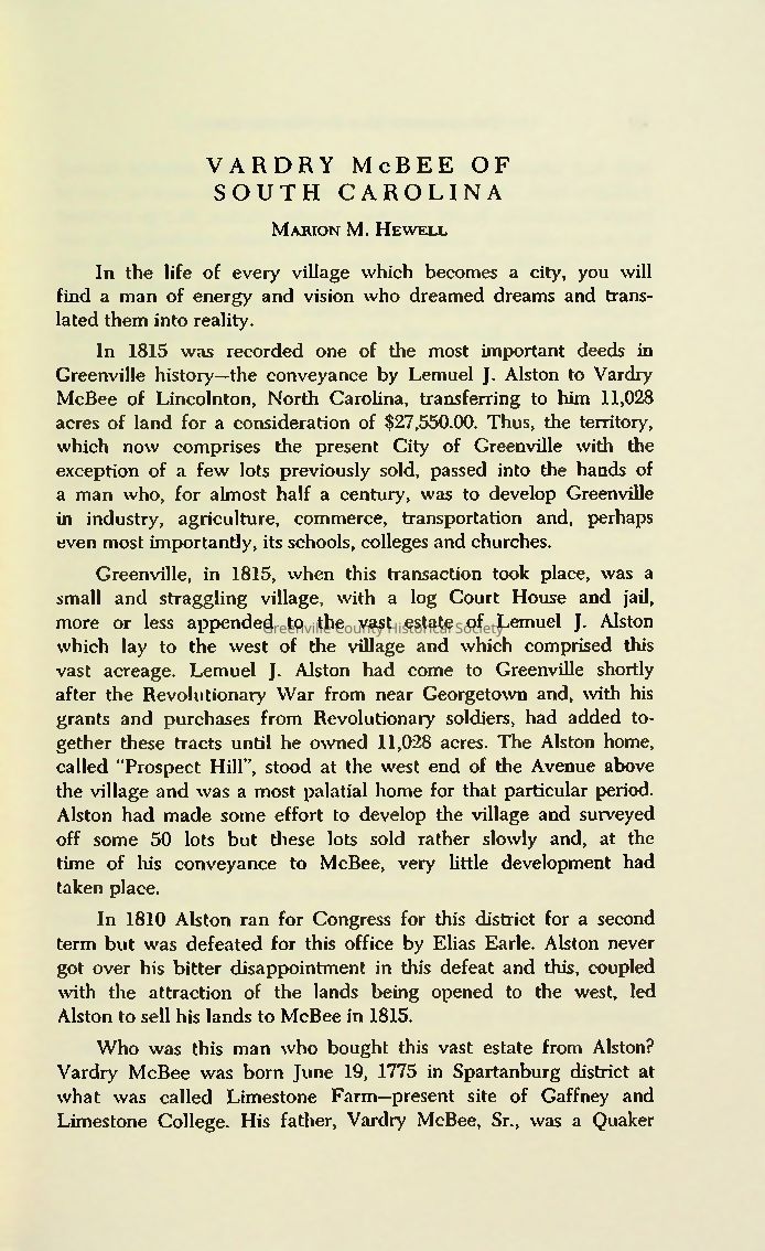 Vardry McBee, often called the “Father of Greenville,” purchased 11,028 acres in 1815 and transformed a small village into a thriving city. A visionary industrialist and philanthropist, McBee founded flour, paper, cotton, and woolen mills, established chain stores, promoted agriculture, and supported education, including the founding of Furman University and the Greenville Academies. He was instrumental in railroad development, contributing large sums and serving briefly as president of a major railway. A Unionist turned secessionist late in life, McBee’s commitment to public good and progress defined Greenville’s early growth. He remained active well into his 80s before retiring.Collection
