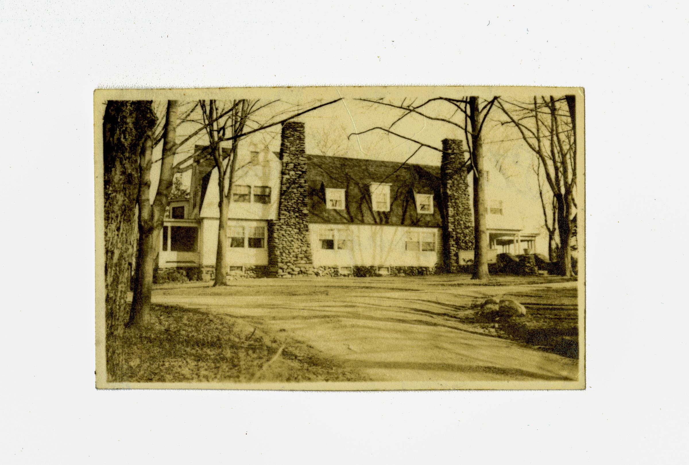 A Dutch Colonial home with two fieldstone chimneys.