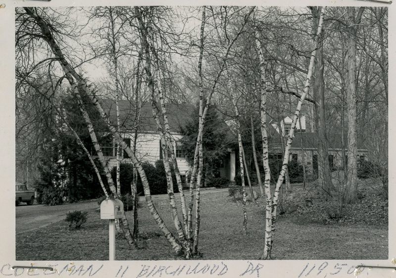 Colonial-style house built in 1952 viewed from its birch tree filled lawn.