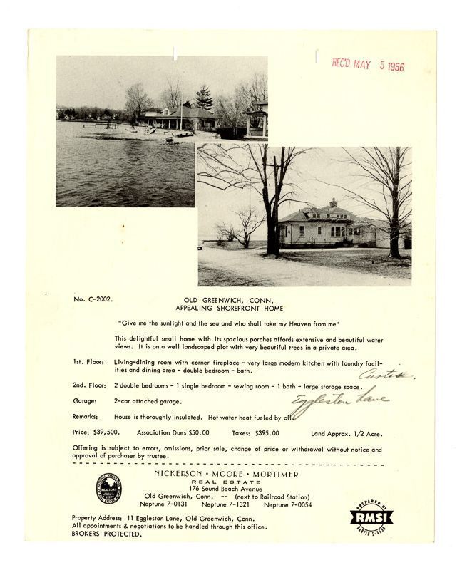 Ad with an image of the house from the water and one from its driveway. Ad also includes information on the rooms and price of the house.Collection