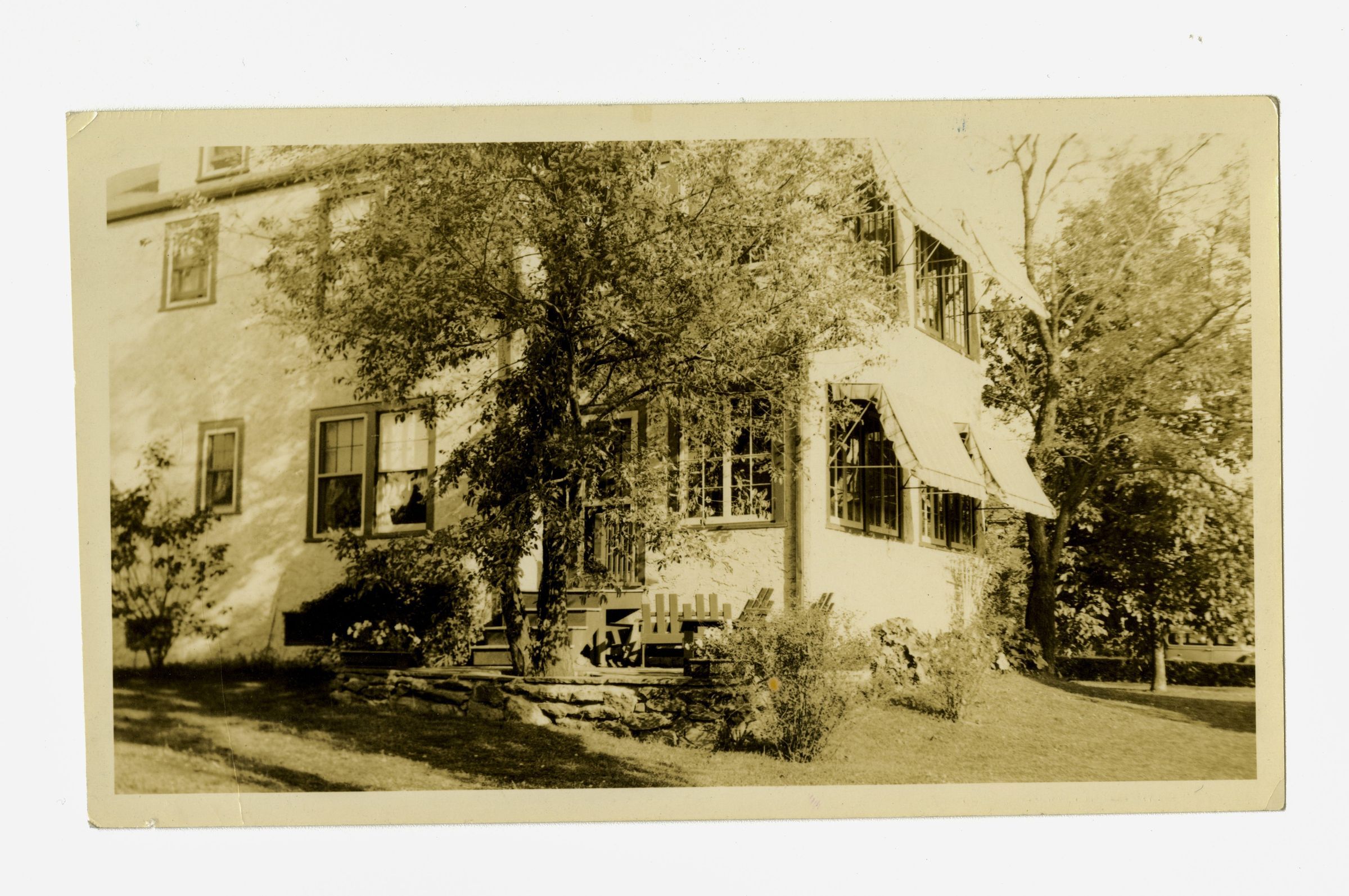 A view of part of a three story house with awnings over its windows and part of its lawn.