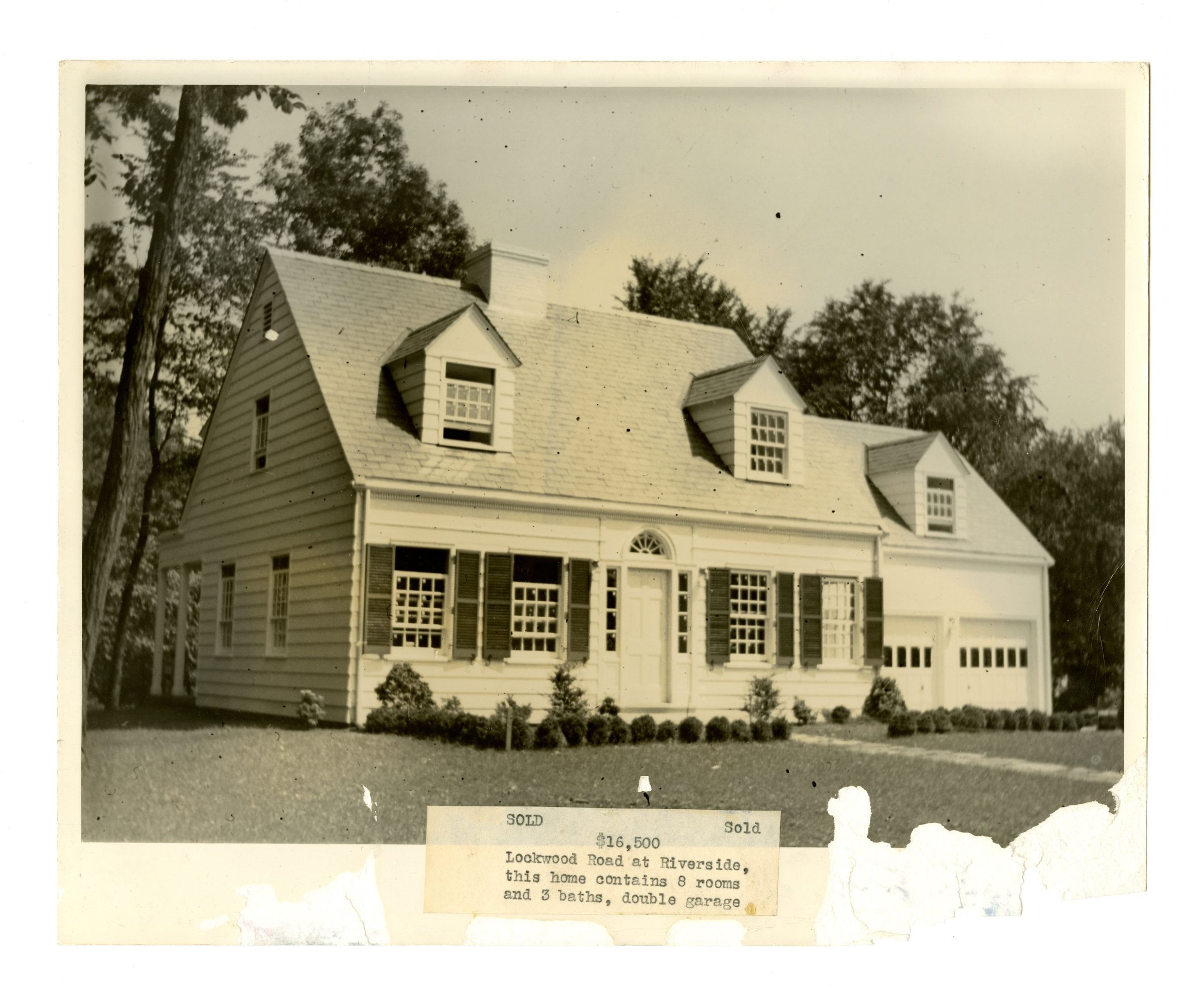 A front view of a two-story clapboard house with a two-door garage on the right of the image.