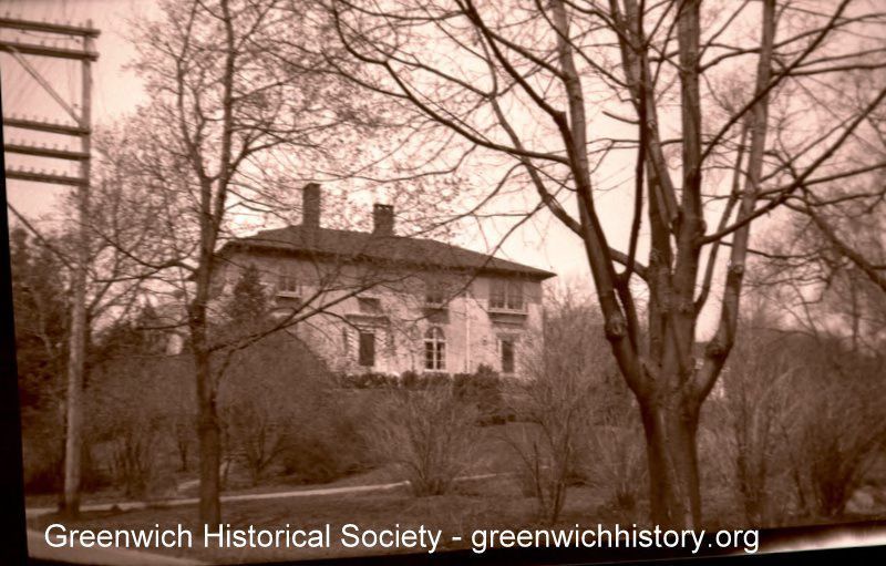 Street view of Italian villa from the front with mature landscaping and second story addition above the side wing. A utility pole is near the driveway