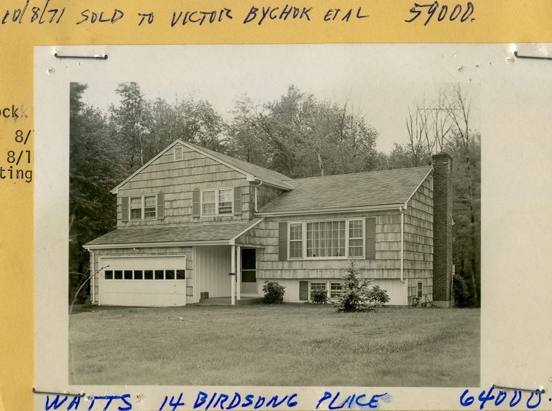 Colonial-style split level house built in 1967 with shingle siding and a garage viewed from its lawn.