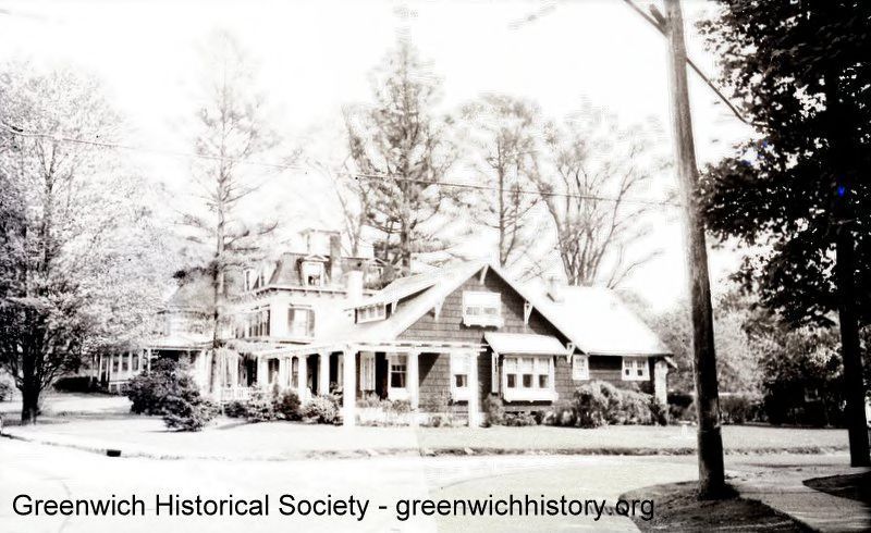 Two story asymmetrical home with a one-story covered walkway held up by piers with slanted sides. There are multiple windows and gabled dormers with triangle pediments. On the side facade there is a window with a bracketed top.Collection