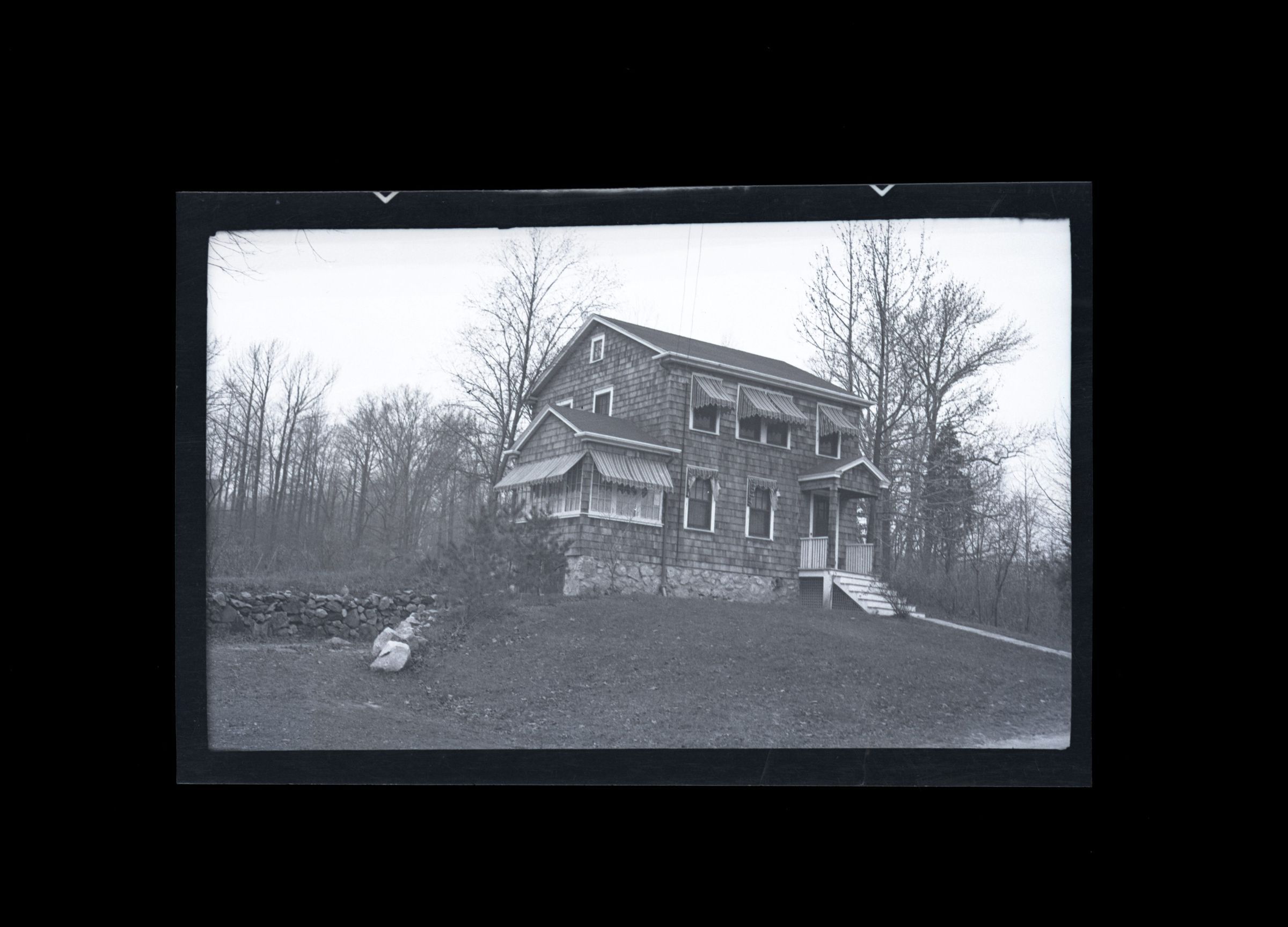 A three story shingle house with awnings over its windows.