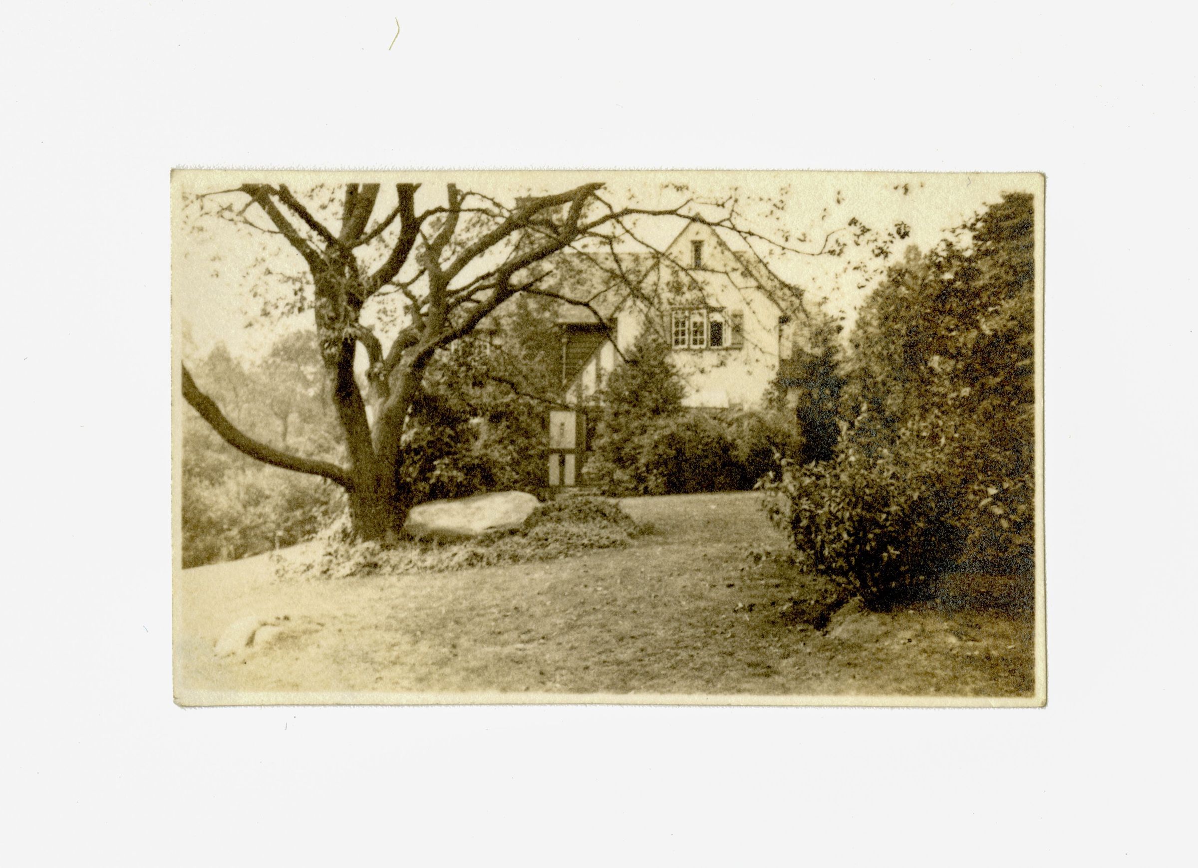 A view of the side of a three story house and its tree-filled lawn.