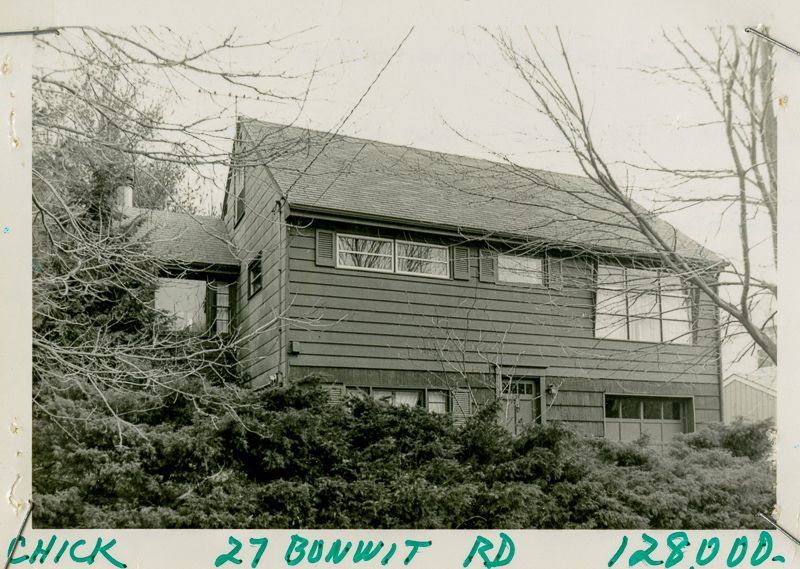 Cape Cod house built in 1957 with clapboard siding and a garage viewed from its lawn.