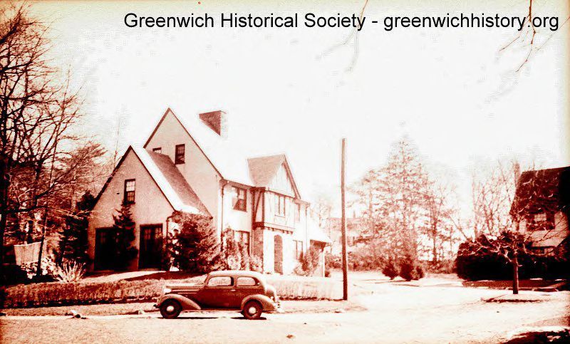 Two story home at 3 Maher Court, circa 1937, with a car parked in the road nearby. The house has a split timber center gable and projecting second story area over a recessed stone entrance and an attached garage. The owner of the house at that time was Mannheimer.