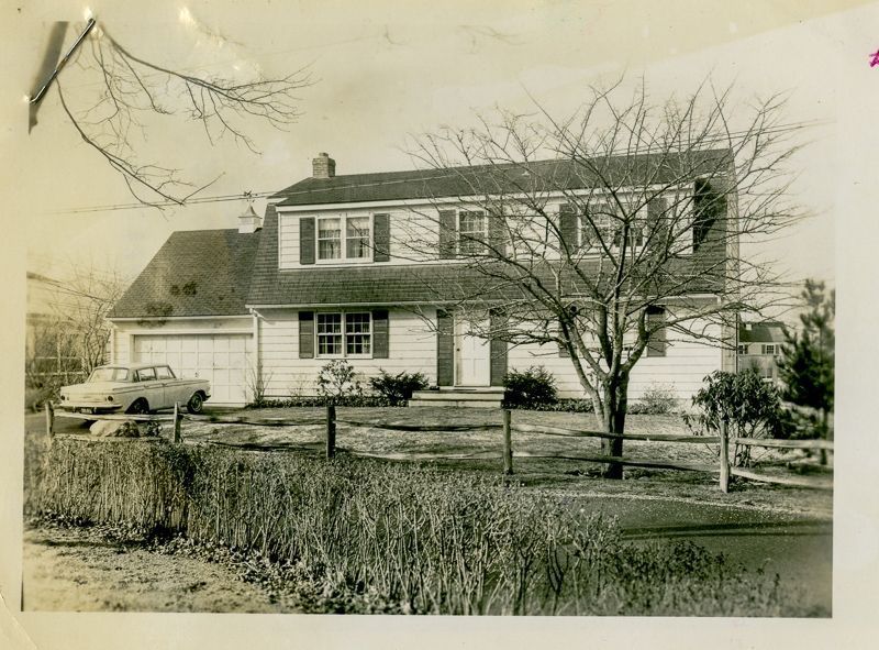 Colonial-style house built in 1960 with a car parked in its driveway viewed from the street.