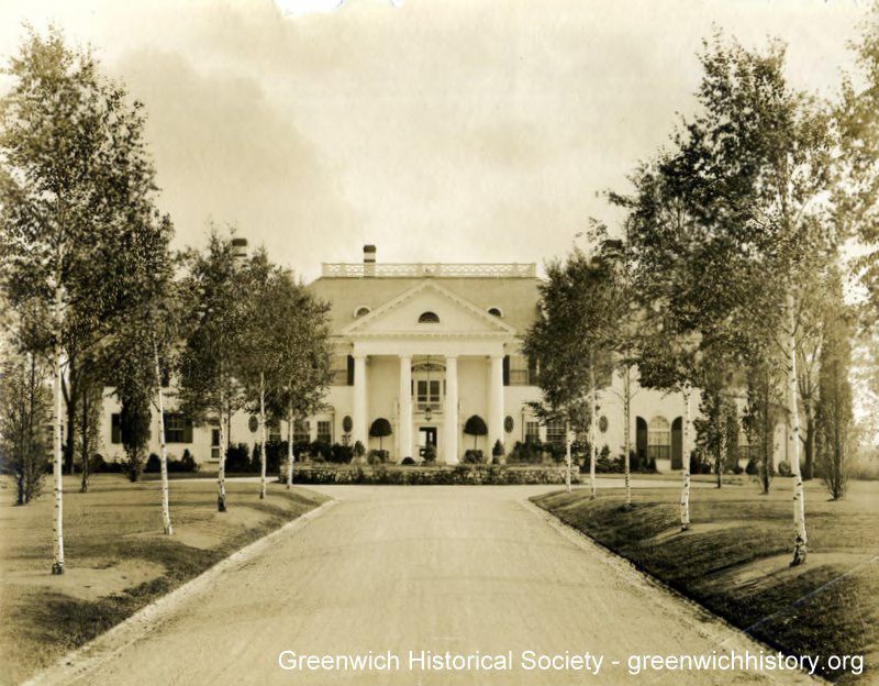 The front drive approach to the main residence of "The Orchards" in Round Hill, lined with birch trees. The thirty two room, Georgian-Colonial style residence was built circa 1909-1919 by Tyler Redfield and was one of several residences on the original 112 acre estate. The house's two story, Greek Revival entrance portico is surrounded by Doric columns. Half-round windows are in the pediment and roof. Above the front door is a balcony surrounding a French door and side windows capped by an elliptical fanlight window. A white balustrade surrounding a widow's walk sits on top of the central portion of the the roof.Collection