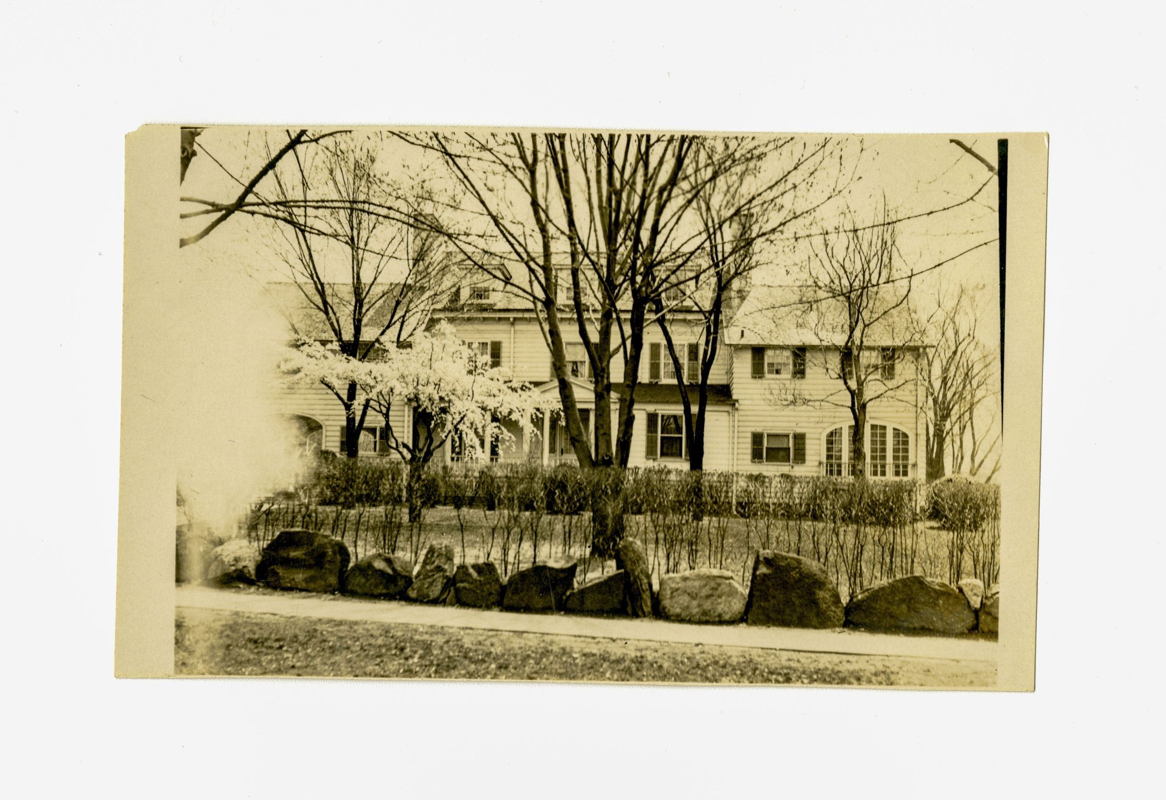 A three story clapboard house with dormers and its front lawn as viewed from the street.Collection