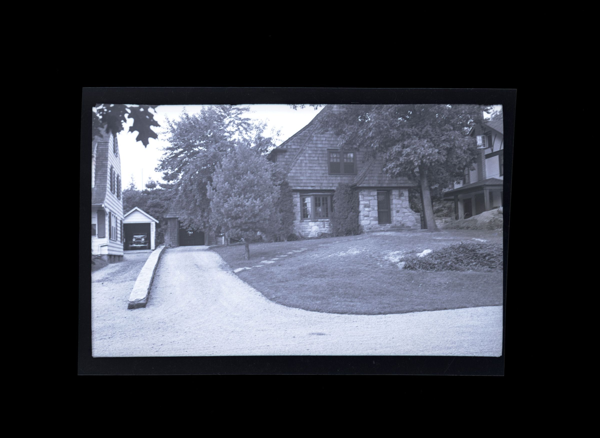A stone and shingle house and its front lawn and driveway viewed from the street. A car is parked in the garage of the neighboring house.Collection