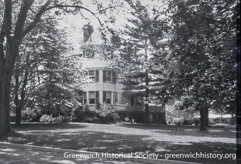 Tower view of 40 Bush Avenue. Two story asymmetrical home with multiple peaks in the roof and a conical tower. It has a wrap around porch. This structure is also known as Kent Cottage.