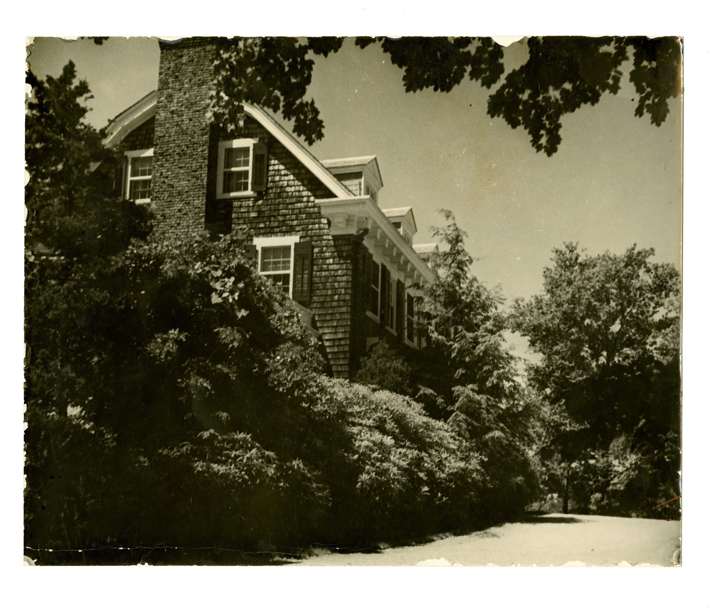 Shingle house with brick chimney, windows with shutters, and white trim.
