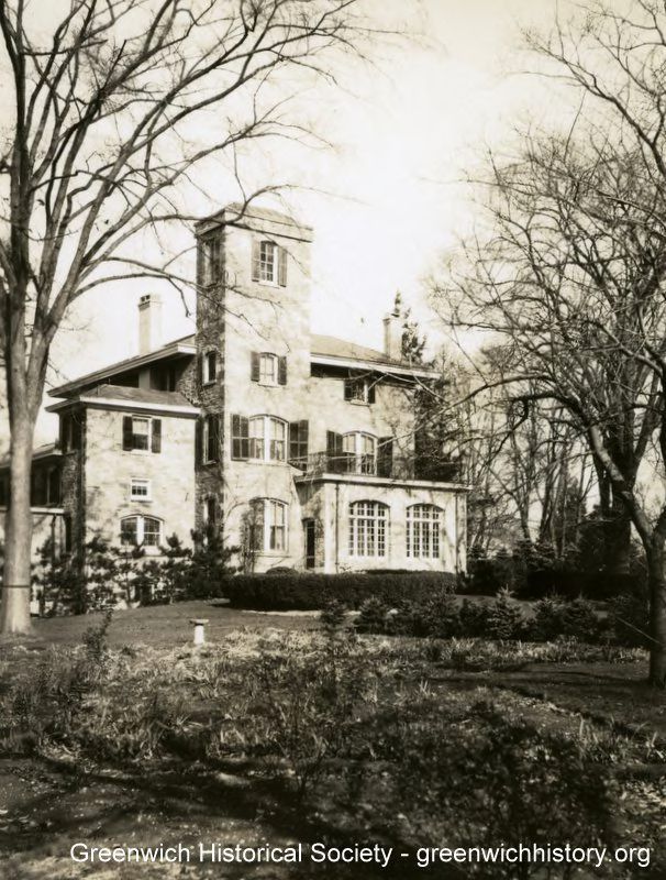 Multi-story, stone house with numerous arched windows, opposing one-story wings in front, and a four story tower on the side.Collection