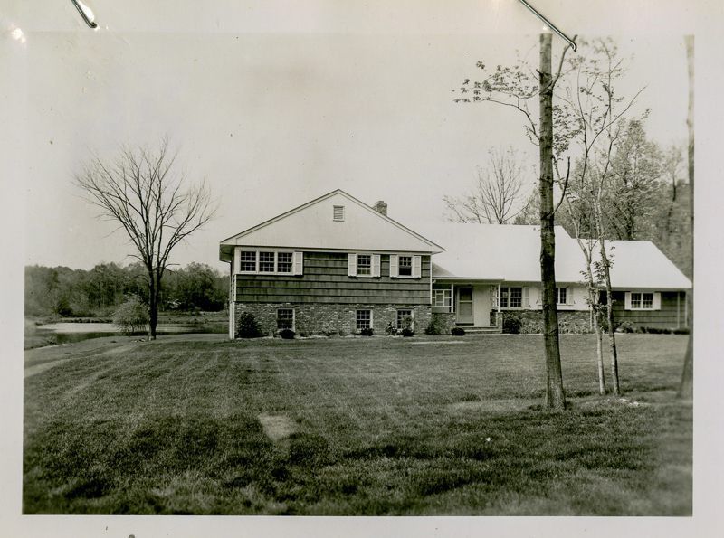 Spilt-level house built in 1960 viewed from its lawn with a pond in the background.