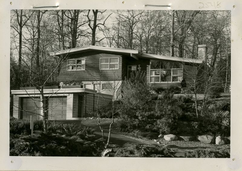 Two story contemporary house built in 1959 with a two door garage viewed from the street.