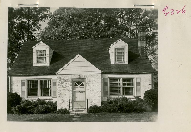 Two story brick house built in 1948 with two small dormers viewed from its lawn.