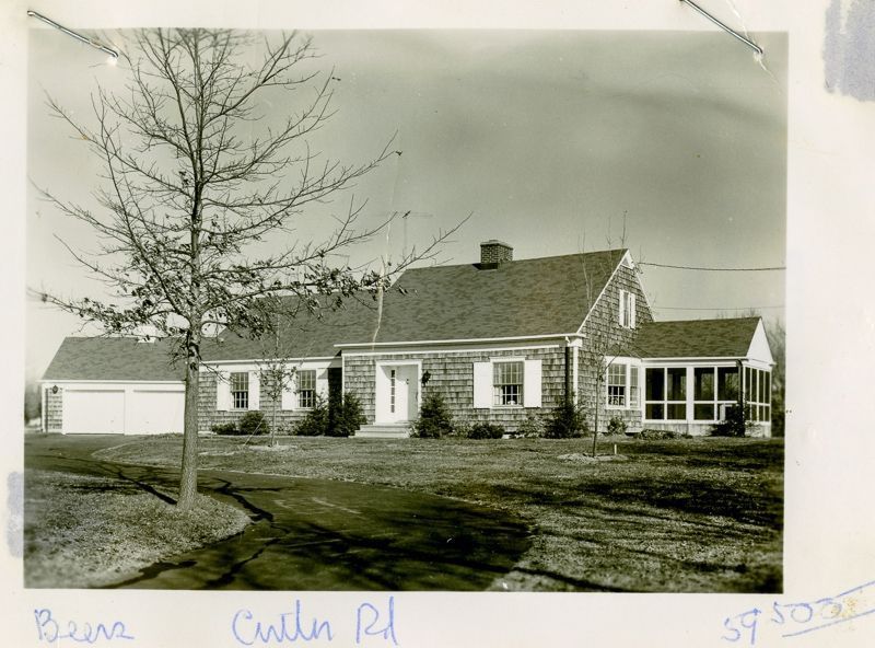 Colonial-style house built in 1959 with shingle siding, a screened in deck, and a two door garage viewed from its driveway.