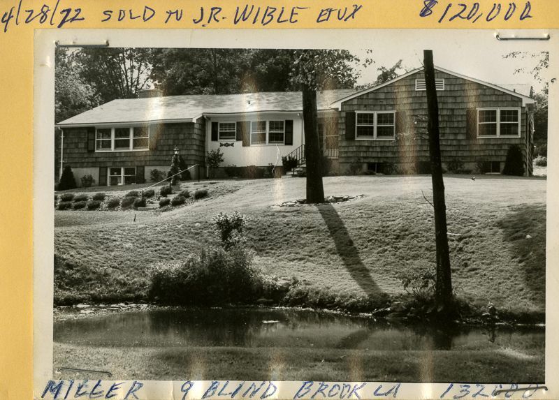 Shingled ranch house built in 1971 with a small pond in its lawn.