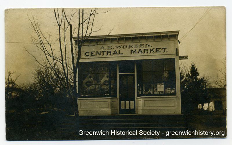 A one-story storefront building with a sign that reads, "A.E. Worden Central Market." The building has large windows and dentils. This was the only grocery store in Cos Cob in the early 1900's. Mr. Albert Finiels, one of the last three living, original "Seaton's Indians" of Cos Cob, was a nephew of Mr. A.E. Worden, owner and proprietor of the store. "Al" Finiels worked before and after school, and on Saturdays as delivery boy. Al also worked as an assistant in the store.Collection