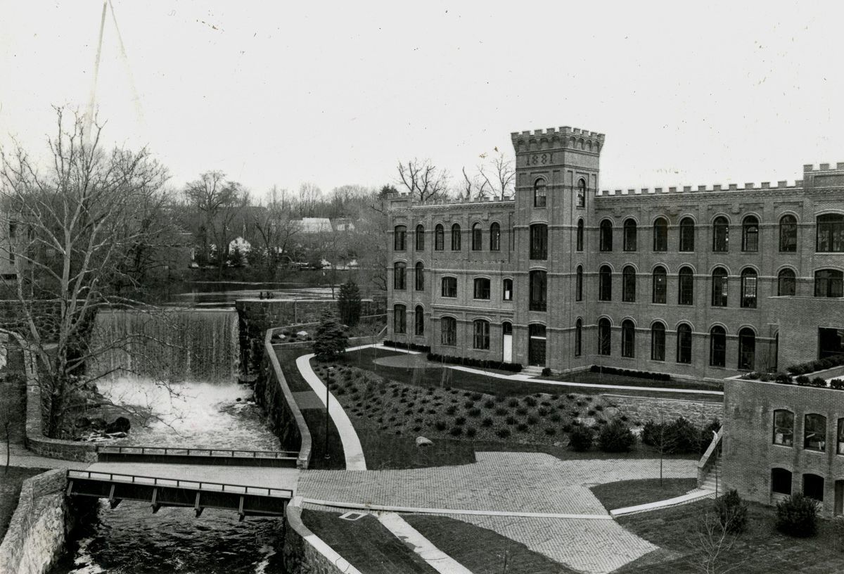 A view of the American Felt Company's mill on the Byram River. The mill complex is comprised of an 1879 Queen Anne style depot and the 1881 Gothic Revival brick 'new mill' visible in this image.Collection