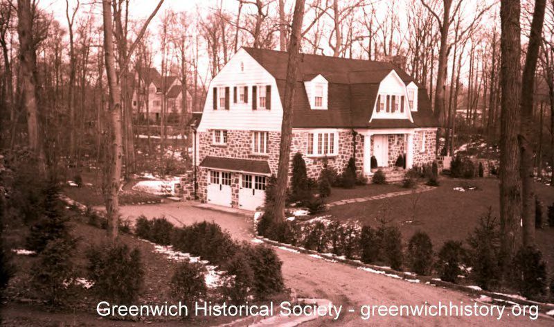 Fieldstone house on the north side of Anderson Road in Milbrook with gambrel roof, front dormers and a columned portico.