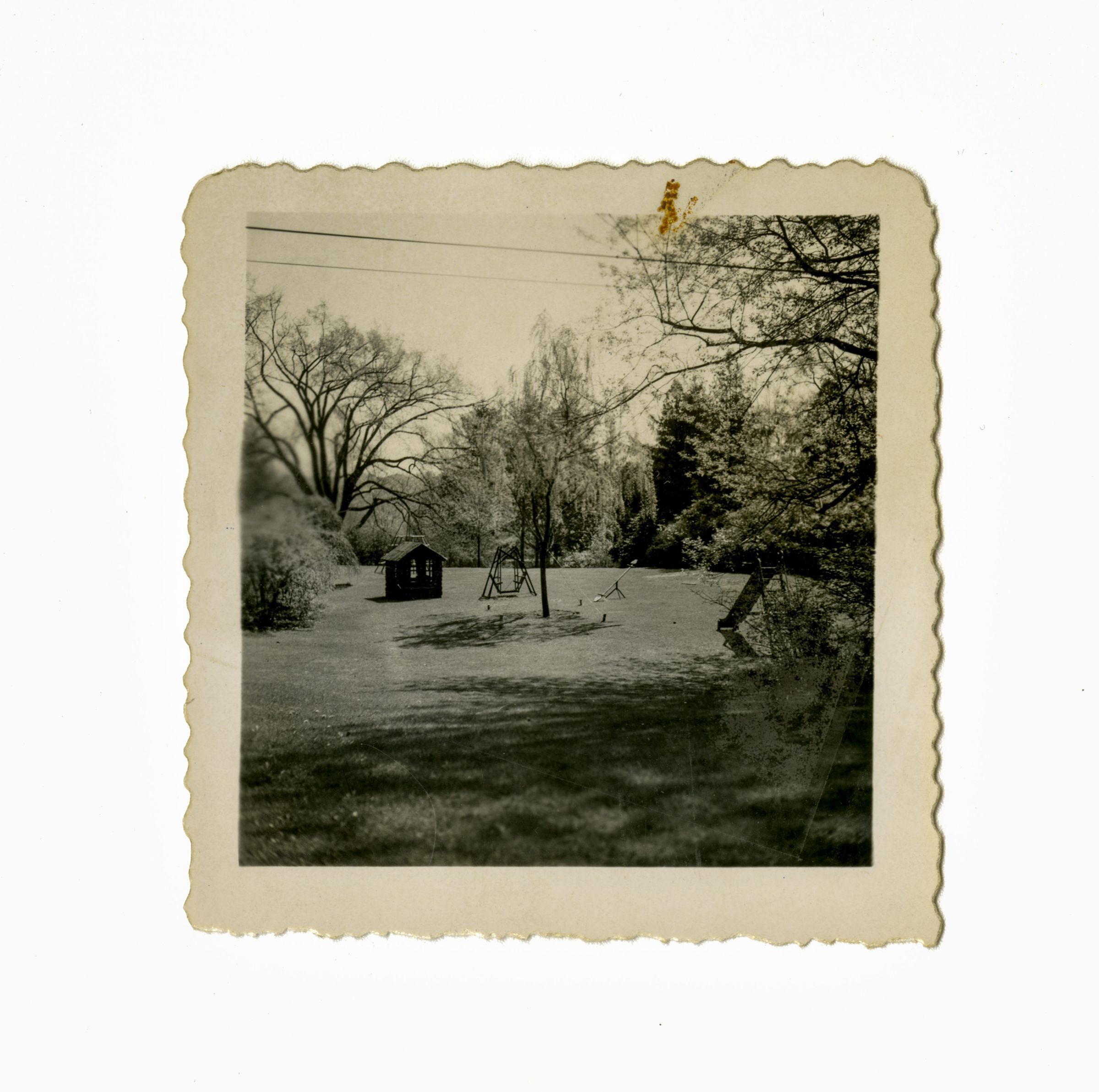 An area of the lawn with a slide, see-saw, swing, playhouse and what appears to be the frame for a teepee visible.Collection