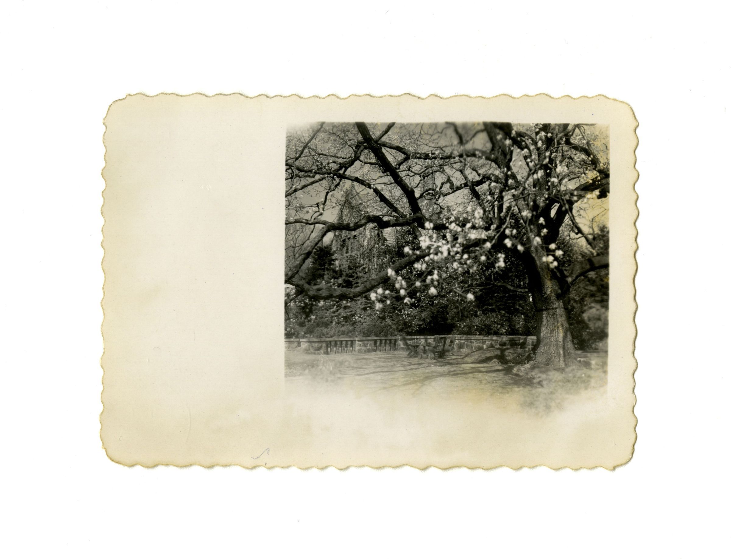 A flowering tree in the grounds with a portion of the house visible in the background.Collection