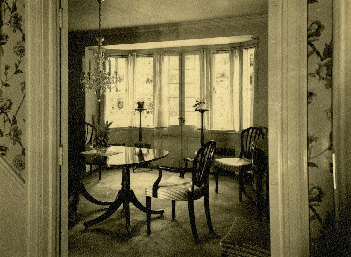 View through a doorway of a sitting/dining room.