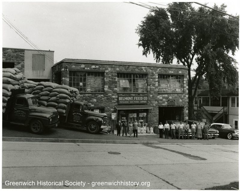 Field stone commercial building with large windows and a sign reading "Belmont Feed Co. Fertilizers Dog Foods Supplies" Two trucks heavily loaded with bags are parked on the left , eight workers stand in front of cars parked on the right, and three men and a woman stand near the front entrance of the building.Collection