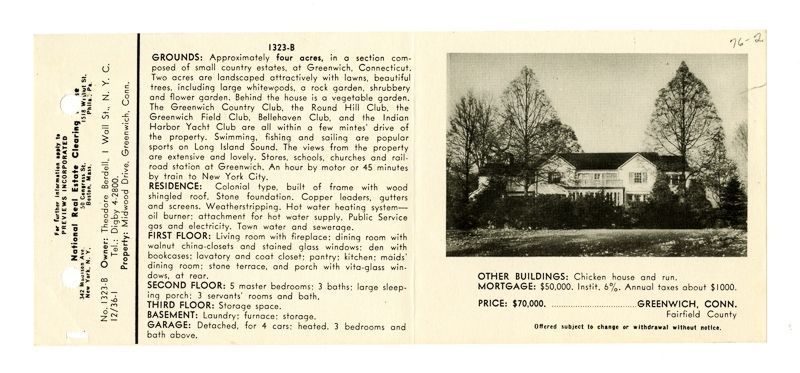 Ad with an image of the house and information on its location, grounds, rooms, and price.