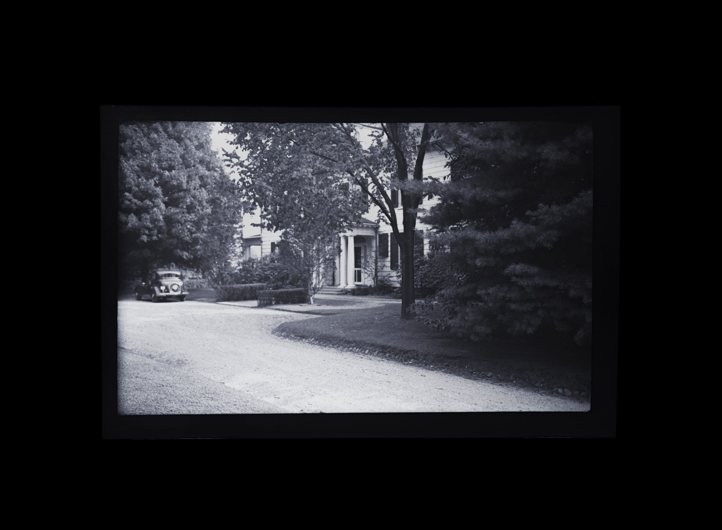A partially tree-obscured view of a three story house viewed from its driveway where a car is parked.