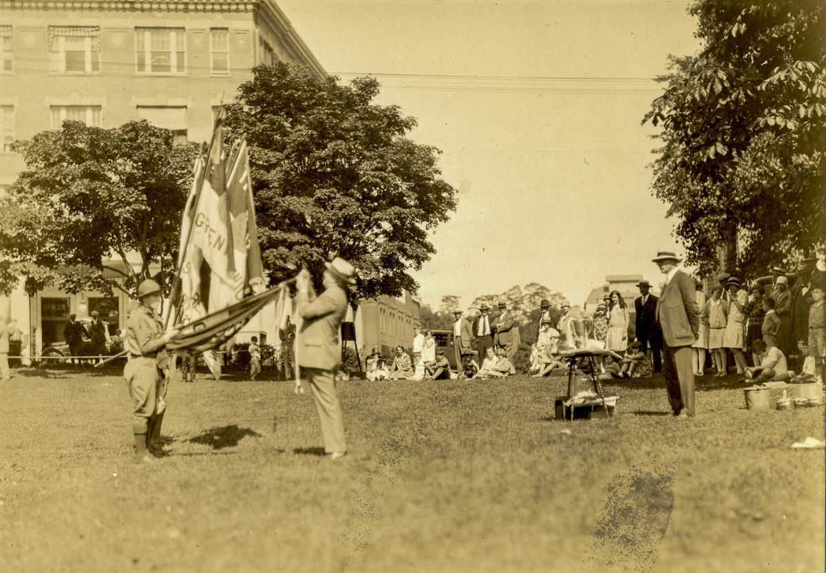 Boy Scouts on Havemeyer Field with flags being watched by a small crowd.