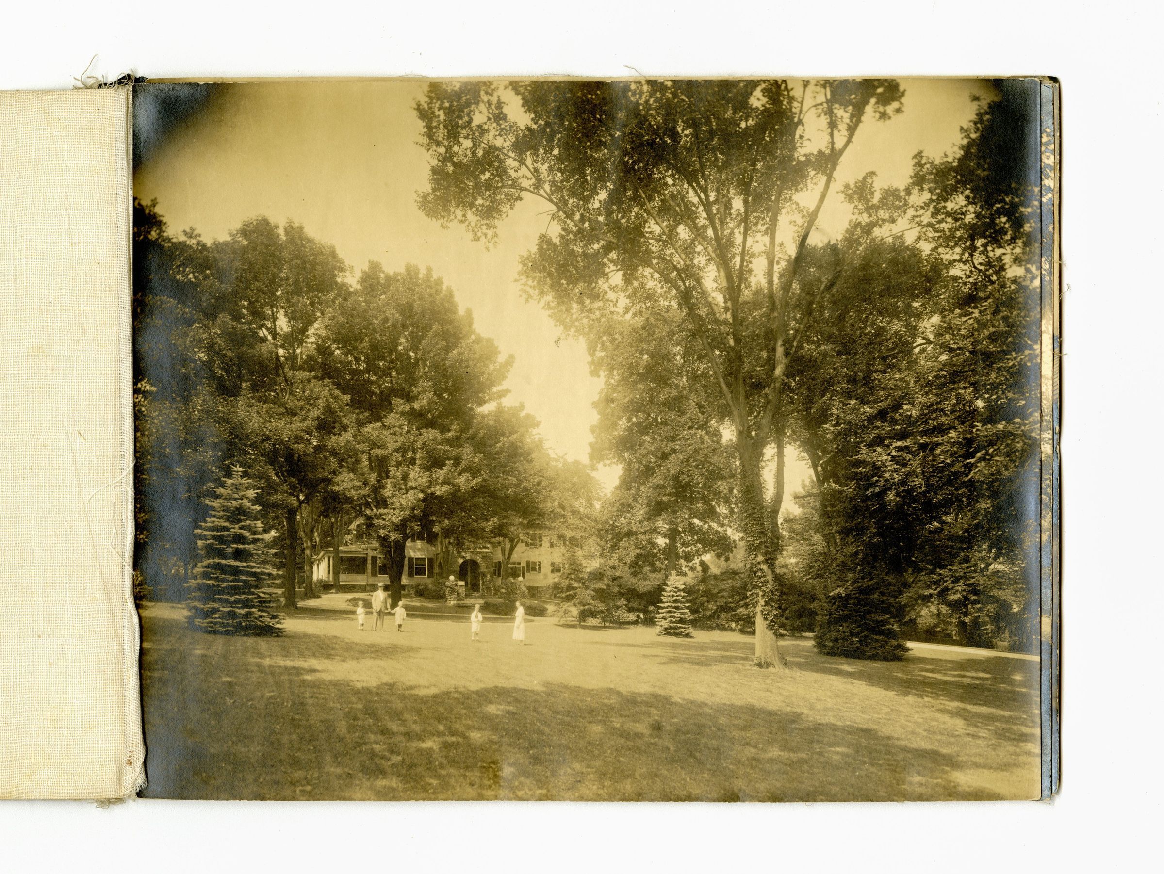 A view of part of the lawn looking towards the house with a man, woman, and three children in the lawn.