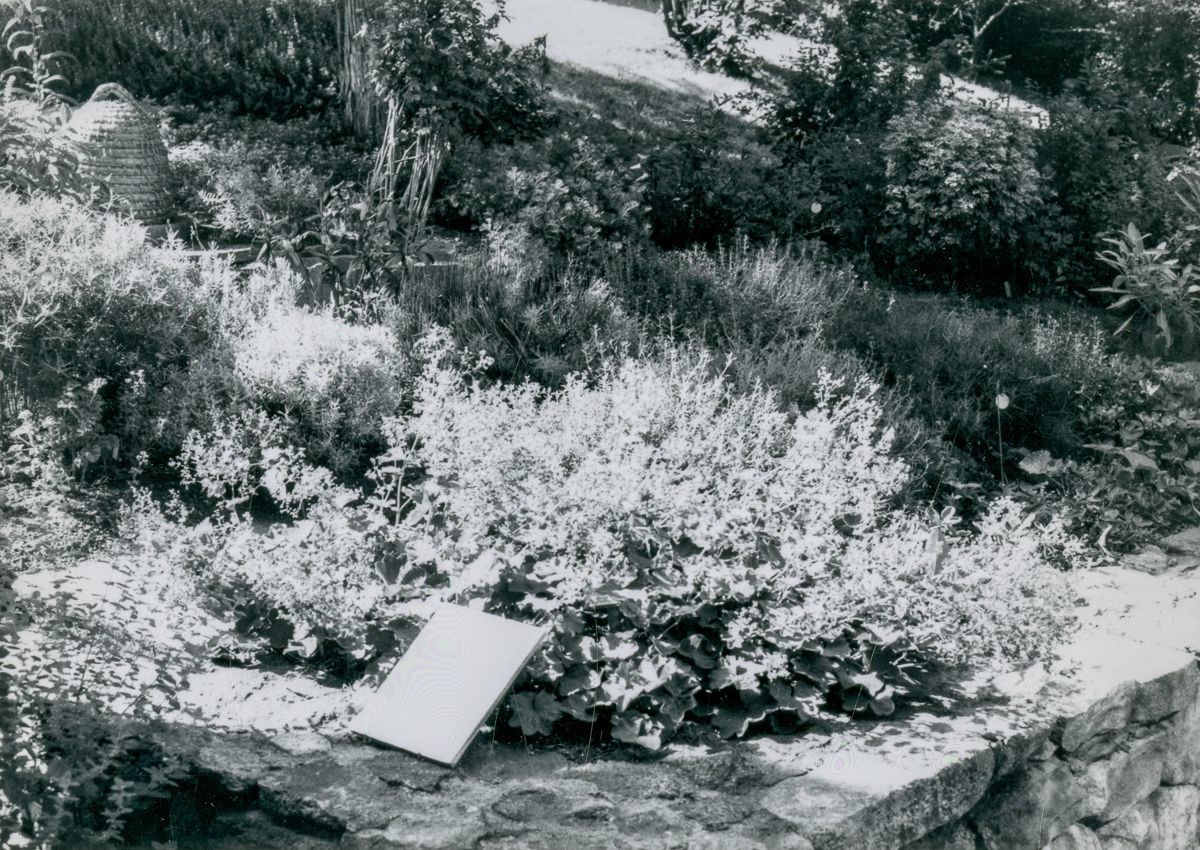 View of the Bush-Holley House garden with a skep style beehive.