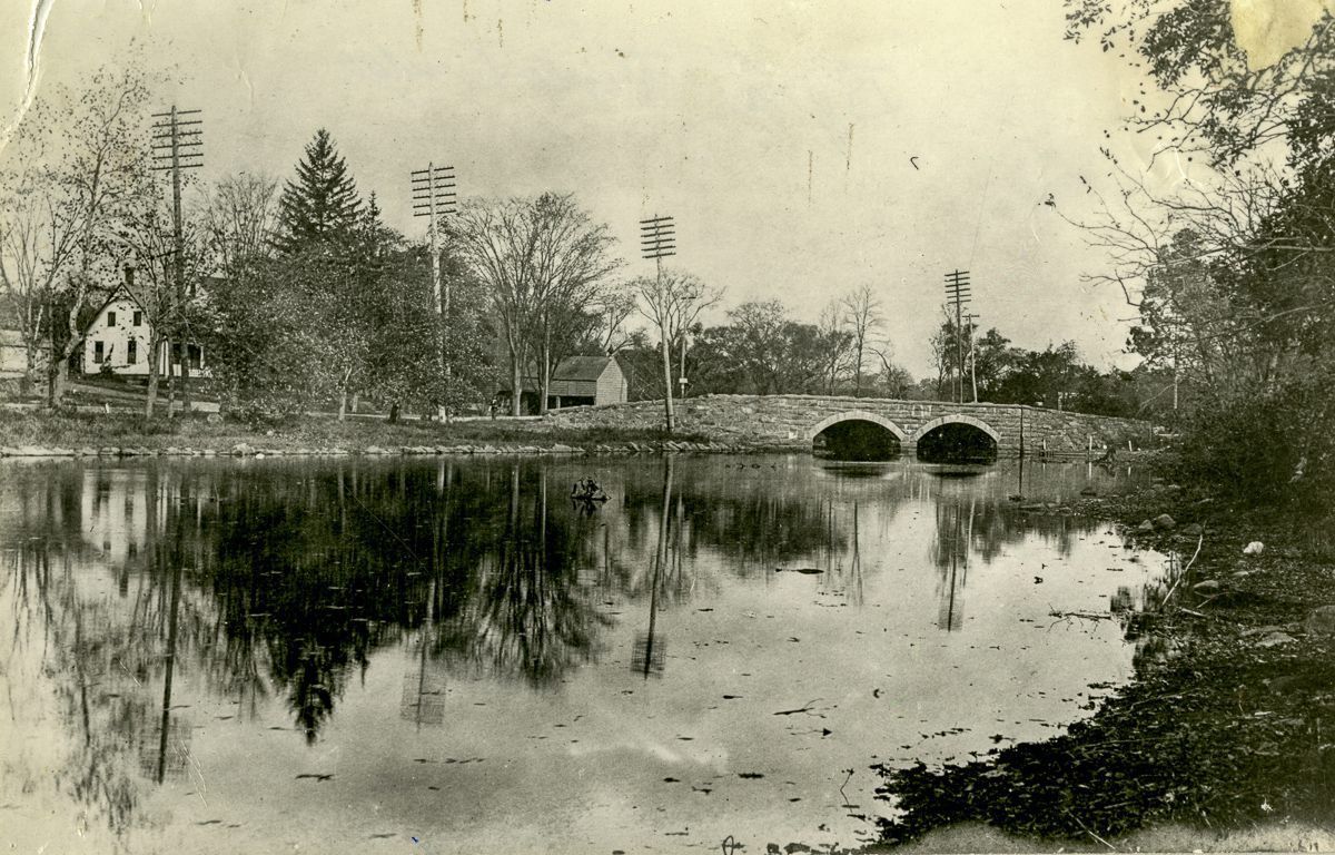 Looking north up the Byram River towards the Post Road bridge; Port Chester is on the left of the image.Collection