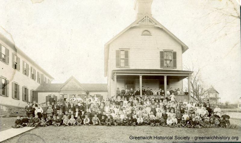 Children and adults gathered in rows in front of a white clapboard two story house with porch, attaching at the rear to a clapboard one story connecting wing and a two story buildingCollection