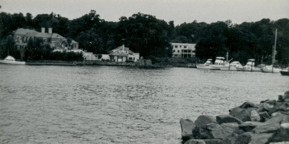 A view of Belle Haven houses on Shore Road and part of the Greenwich Boat & Yacht Club's marina, facing south-west.