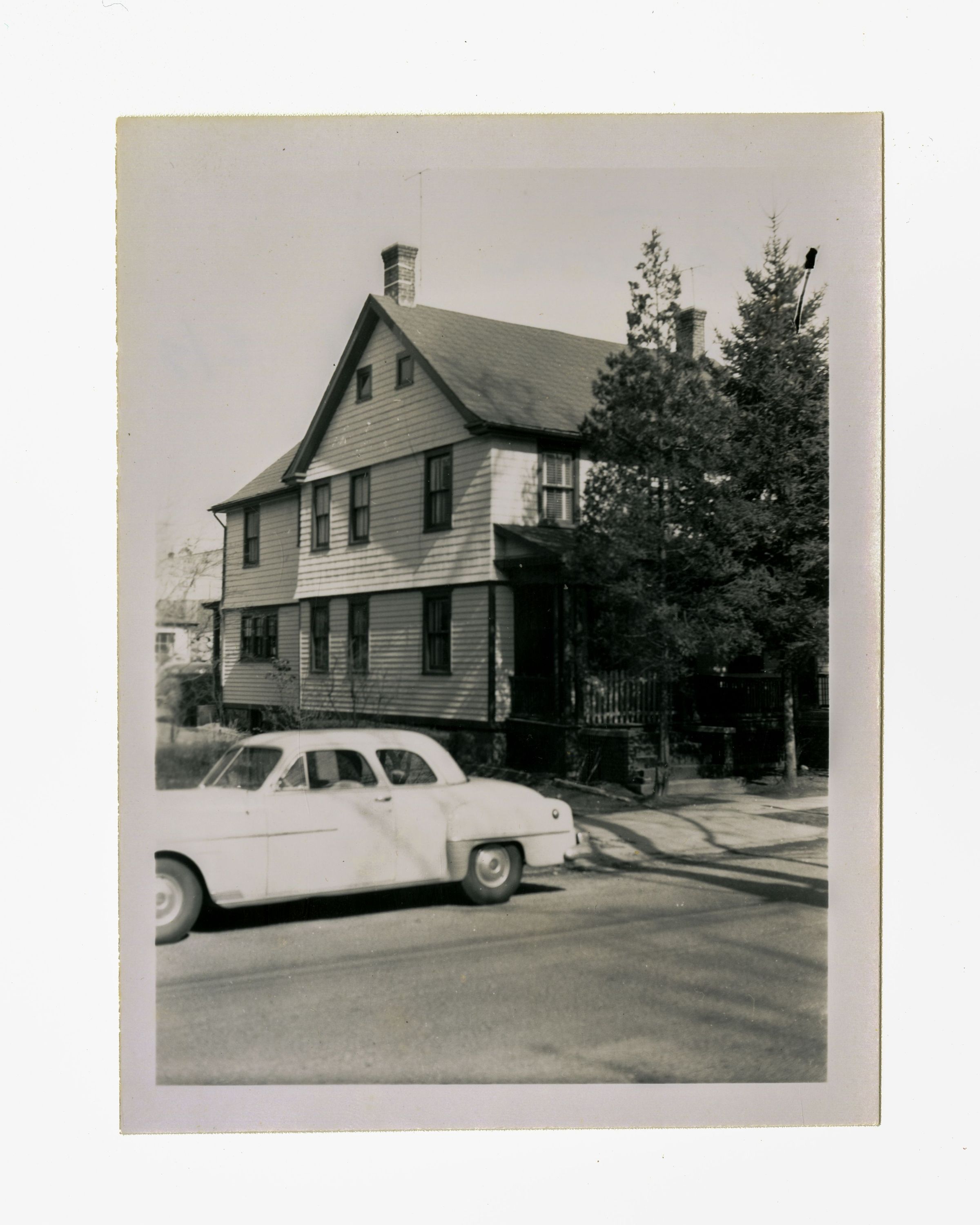The side of a three story shingle house; a car is parked on the street in the foreground of the image.Collection
