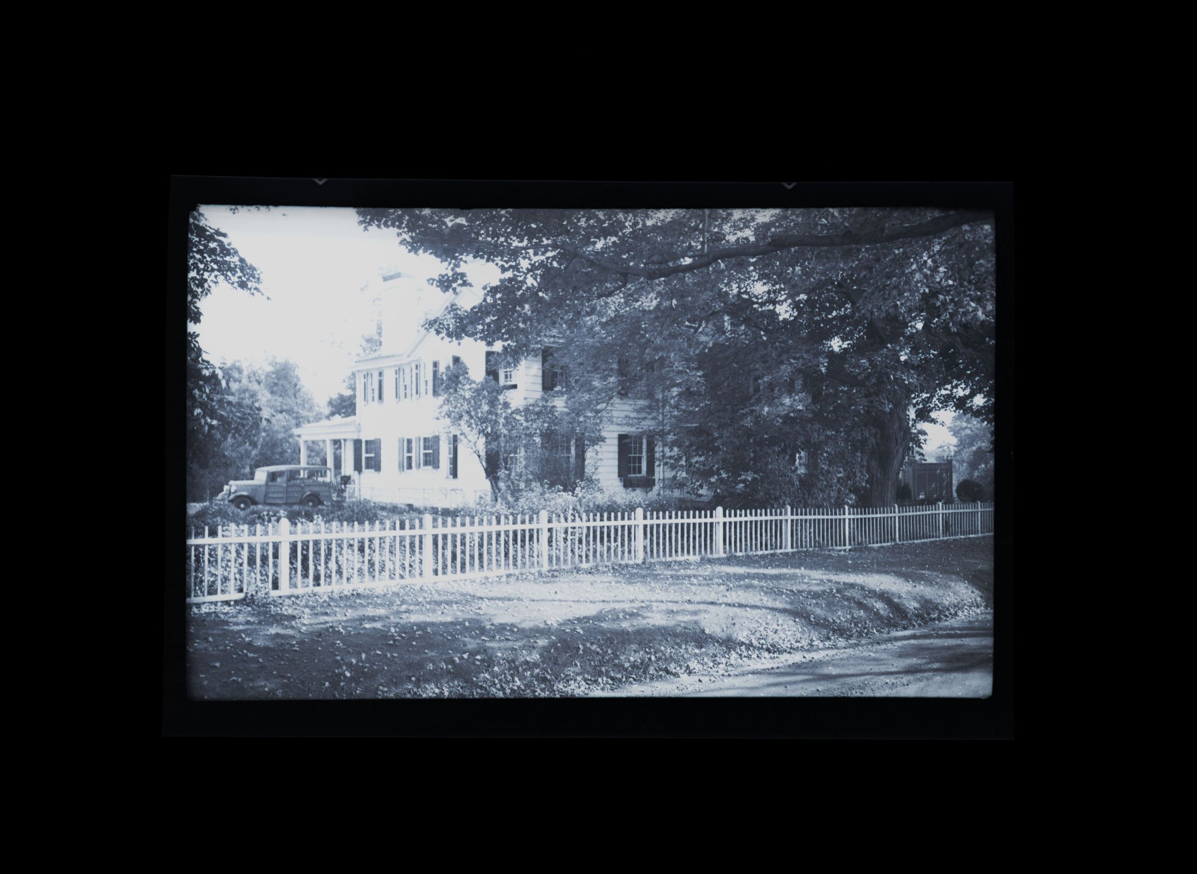 A two story house with a car parked in its driveway, as viewed from the street.Collection