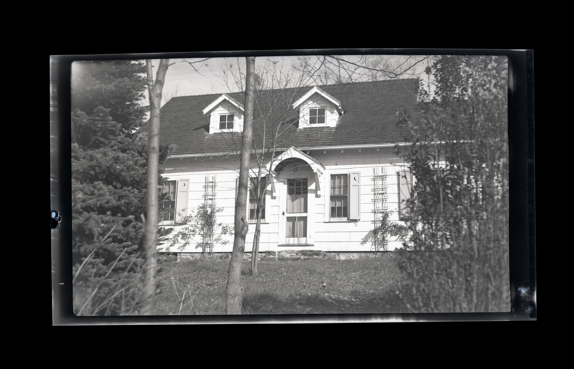 The front of a two story shingle house with two small dormers and part of its lawn.Collection