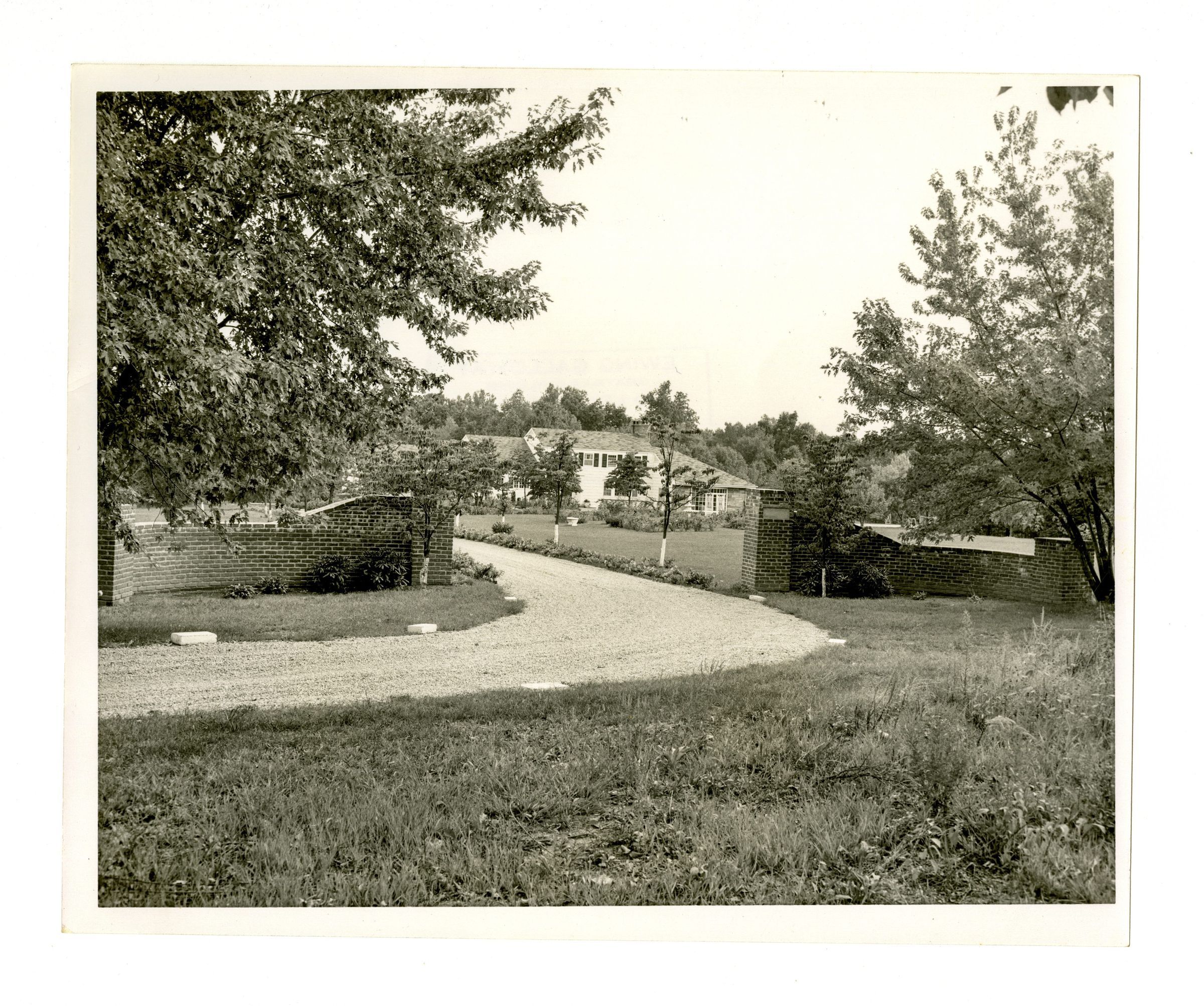 A view of the house's entranceway flanked by brick walls with the house in the background.